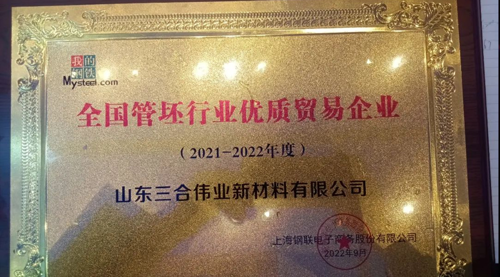山東三合偉業新材料有限公司榮獲2021-2022年度“全國管坯行業優質貿易企業” 2023年山東三合偉業新材料有限公司將再次整裝待發,穩健經營,在實現可持續發展的同時幸福員工,回報客戶。