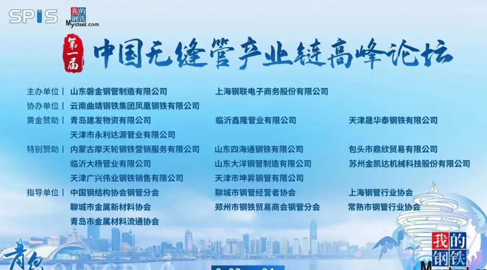 由山東磐金鋼管制造有限公司、上海鋼聯電子商務股份有限公司聯合主辦,云南曲靖鋼鐵集團鳳凰鋼鐵有限公司協辦,中國鋼結構協會鋼管分會、聊城市鋼管經營者協會、上海鋼管行業協會、鄭州市鋼鐵貿易商會鋼管分會指導的“第一屆中國無縫管產業鏈高峰論壇”于2023年2月23日(周四)-2月24日(周五)在青島香格里拉大酒店隆重舉行。